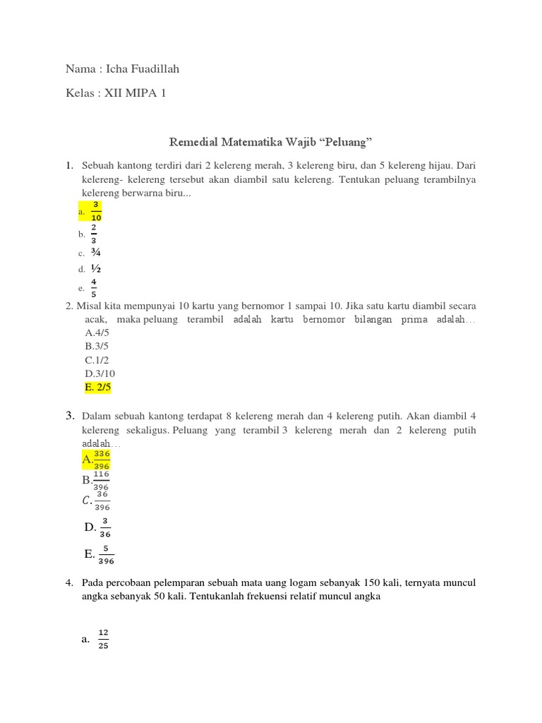 Pembahasan prediksi soal hots tentang peluang. Dari kotak diambil dua bola secara acak. Dari dalam kantong tersebut diambil 2 bola sekaligus. S = mengambil 2 bola sekaligus dari 12 bola. Dari dalam kotak tersebut diambil 2 bola sekaligus. Sebuah kantong berisi 15 bola merah, 12 bola biru, dan 3 bola hijau. Sebuah kantong berisi 5 bola merah, 3 bola putih, dan 2 bola hijau. • banyak bola merah = 5 dan putih = 3 → jumlahnya = 8 • banyak cara mengambil 2 dari 5 → 5c2 = = = 10 = − )!25(!2 !5 !3!.2 !5 2.1 5.4 53. Dalam sebuah kardus terdapat 10 bola berwarna merah, 7 bola berwarna kuning dan 3 bola berwarna hitam. Sebuah kantong berisi 5 bola merah, 3 bola hijau, dan 2 bola biru. Sebuah kantong berisi 2 bola merah dan 2 bola putih. Dilarang kupas jawaban dari google. Mari menabur benih kebaikan setiap saat selagi masih ada waktu dan kesempatan dari sang pencipta.